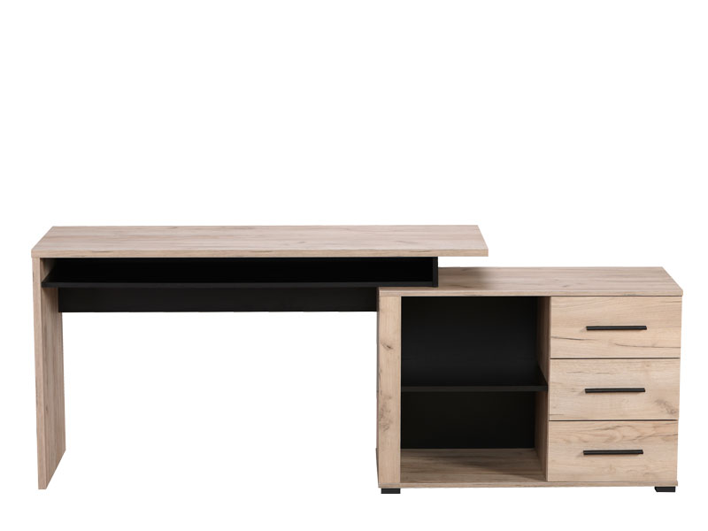 Kompjuter sto ARHIMED, u kombinaciji dekora sivog hrasta i crnog drveta, sastoji se od radne površine stola i podesivog elementa koji se može montirati pod uglom od 90 i 180 stepeni i idealno će poslužiti za sortiranje dokumenata i važnih stvari jer poseduje 3 praktične fioke i otvoreni dio sa policom.
