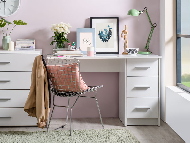 Kompjuter sto LEO, u opak bijelom dezenu, sa prostranom radnom površinom i funcionalnim sistemom fioka donosi sve neophodno za besprekornu organizaciju radnog prostora.