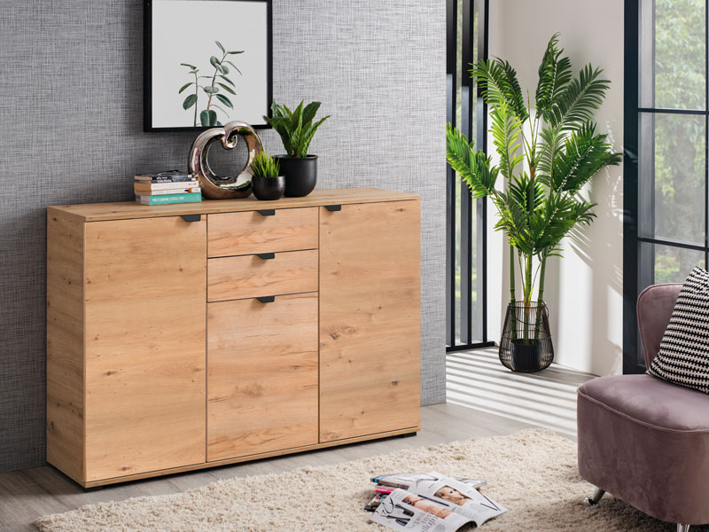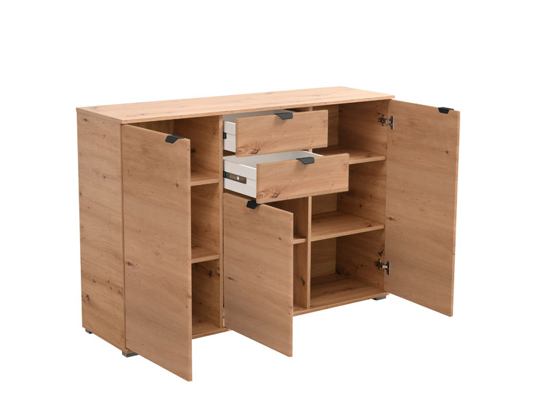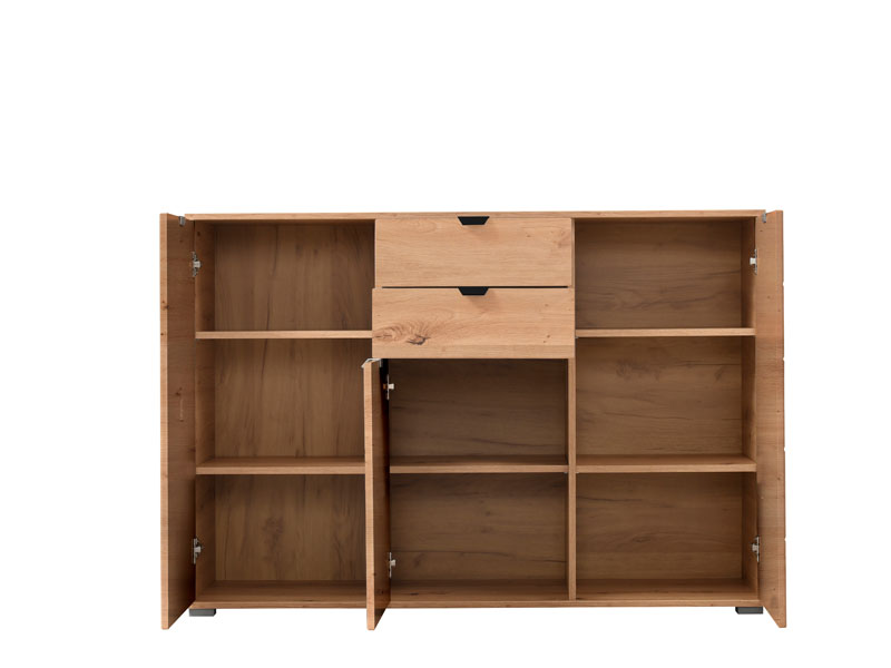 Trokrilna komoda DUERO 3K2F, u dekoru artisan hrast posjeduje dva bočna zatvorena krila sa po tri vertikalne police, kao i centralno pozicioniran segment sa dvije fioke i zatvorenom policom. Zahvaljujući upotrebnom prostoru koji obezbjeđuje svrstava se u elemente velike funkcionalnosti. Komoda DUERO 3K2F je pogodna za opremanje predsoblja, dnevne zone ili spavaće sobe.