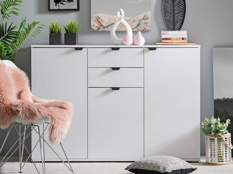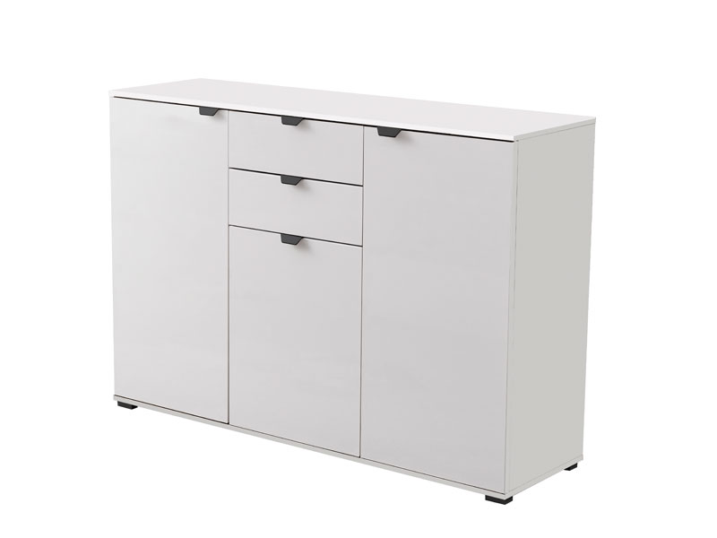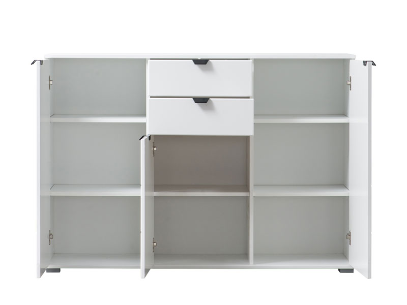 Trokrilna komoda DUERO 3K2F, u opak bijelom dekoru posjeduje dva bočna zatvorena krila sa po tri vertikalne police, kao i centralno pozicioniran segment sa dvije fioke i zatvorenom policom. Zahvaljujući upotrebnom prostoru koji obezbeđuje svrstava se u elemente velike funkcionalnosti. Komoda DUERO 3K2F je pogodna za opremanje predsoblja, dnevne zone ili spavaće sobe.