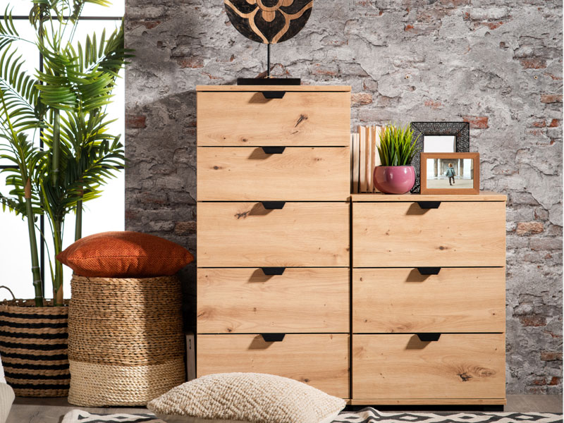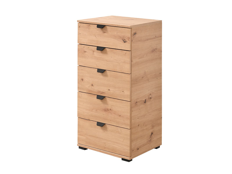 Komoda DUERO 5F 45, u dekoru artisan hrasta je dizajnirana tako da po svojim dimenzijama širine, od 45 cm, ne zauzima mnogo prostora, a zahvaljujući upotrebnom prostoru koji obezbjeđuje pet fioka, spada u elemente sa velikom upotrebnom vrijednošću. Komoda DUERO 5F 45 je pogodna za opremanje predsoblja, dnevne zone ili spavaće sobe.