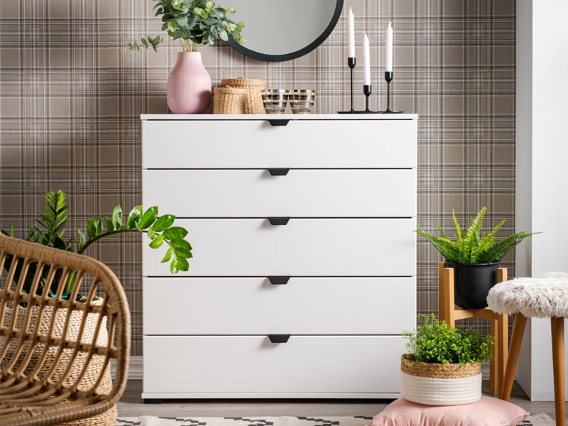 Komoda DUERO 5F 90, u bijelom dekoru dizajnirana je tako da zahvaljujući upotrebnom prostoru koji obezbjeđuje pet prostranih fioka, spada u elemente sa velikom upotrebnom vrednošću. Komoda DUERO 5F 90 je pogodna za opremanje predsoblja, dnevne zone ili spavaće sobe.