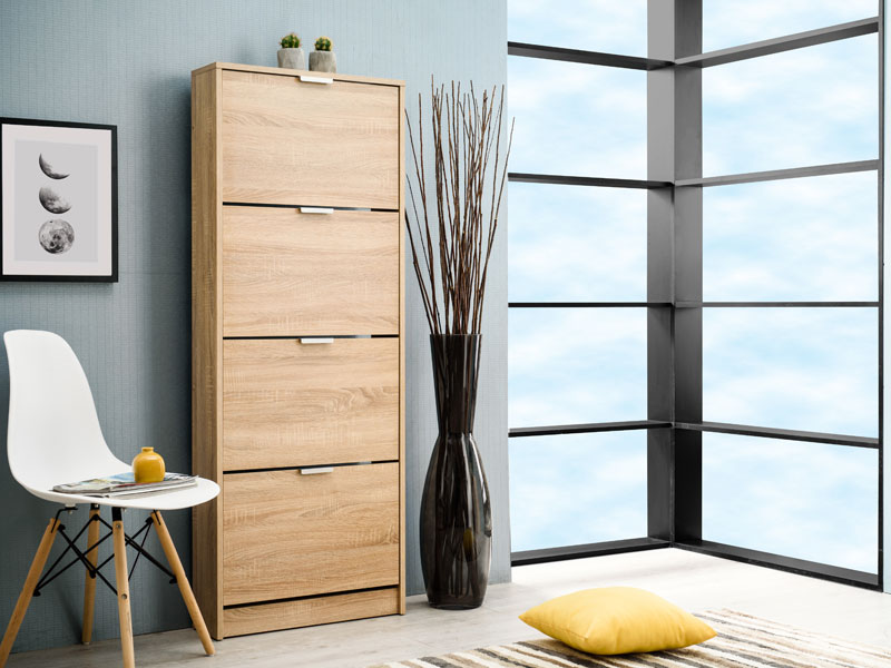 Cipelar BASE 14, u sonoma hrast dezenu, posjeduje četiri police za odlaganje sezonske obuće, a zahvaljujući svojim dimenzijama funkcionalno je rješenje za uređenje predsoblja manjih dimenzija.