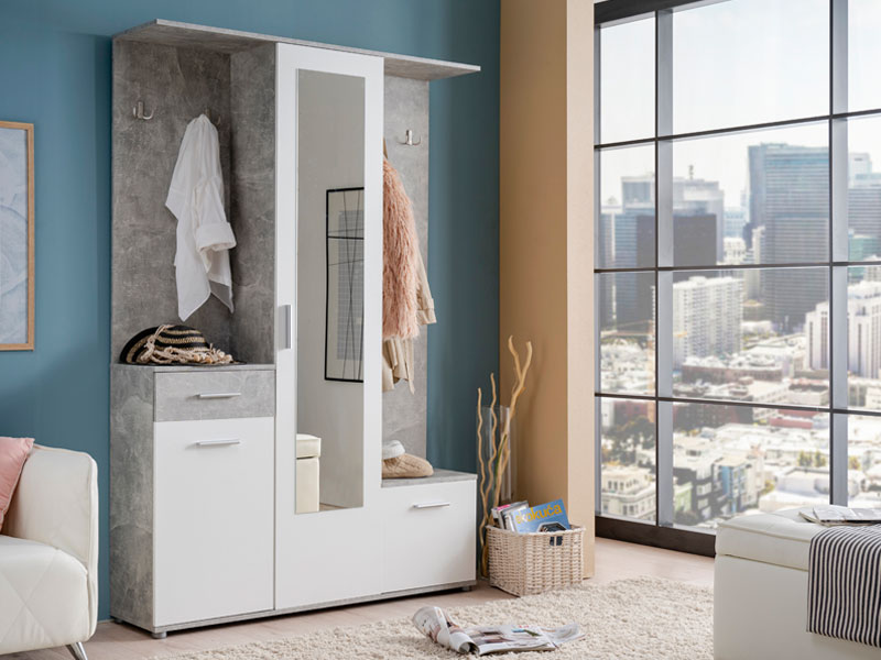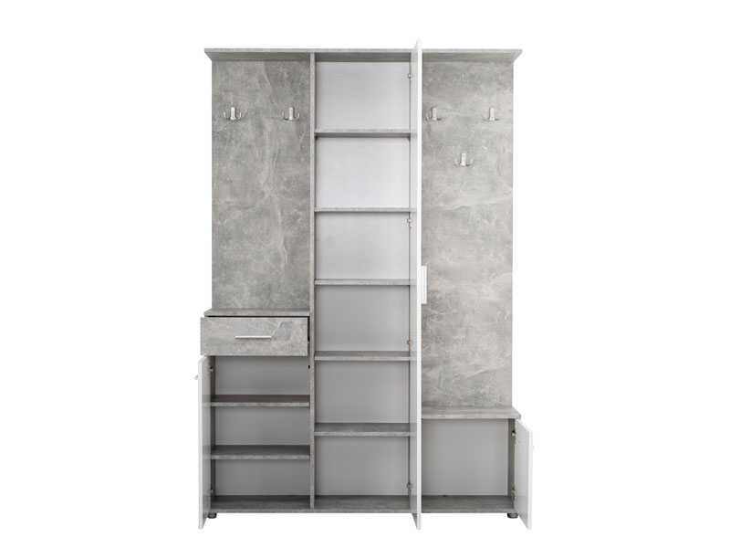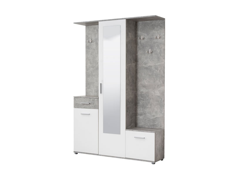 Predsoblje MARTIN, u beton i opak bijelom dezenu, učiniće da prvi suret sa vašim domom bude efektan i prijatan. Ovaj model poseduje skladno organizovan upotrebni prostor za odlaganje sezonske garderobe i obuće tako da ćete postići funkcionalno organizovan prostor, dok centralno pozicionirano ogledalo donosi osećaj prostranosti.