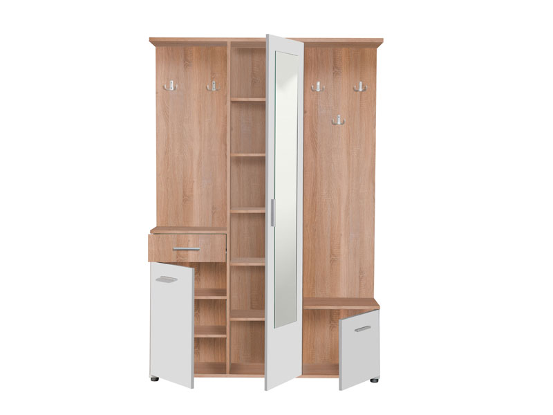 Predsoblje MARTIN, u sonoma hrast i opak bijelom dezenu, učiniće da prvi suret sa vašim domom bude efektan i prijatan. Ovaj model posjeduje skladno organizovan upotrebni prostor za odlaganje sezonske garderobe i obuće tako da ćete postići funkcionalno organizovan prostor, dok centralno pozicionirano ogledalo donosi osećaj prostranosti.