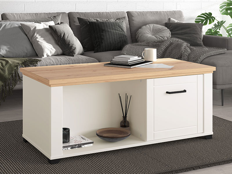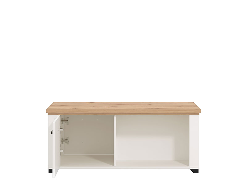 Klub sto VALENCIA M KS u kombinaciji dekora artisan hrasta, opak bijele i bijele mat folije, je dizajnerski privlačno rešenje za uređenje dnevnog boravka, koje daje topliju estetiku enterijeru. Upotrebni prostor čine jedan otvoreni i drugi zatvoreni dio, koji u unutrašnjosti poseduje prostor za odlaganje. Frontovi su obogaćeni crnim ručicama jednostavnog dizajna, a koje su usklađene sa dizajnerskom linijom cijele kolekcije. Pripada istoimenom sistemu elemenata VALENCIA, koji odlikuje funkcionalnost i praktičnost kojoj doprinosi, kako veliki broj elemenata u sistemu, tako i odlična organizacija prostora za odlaganje.