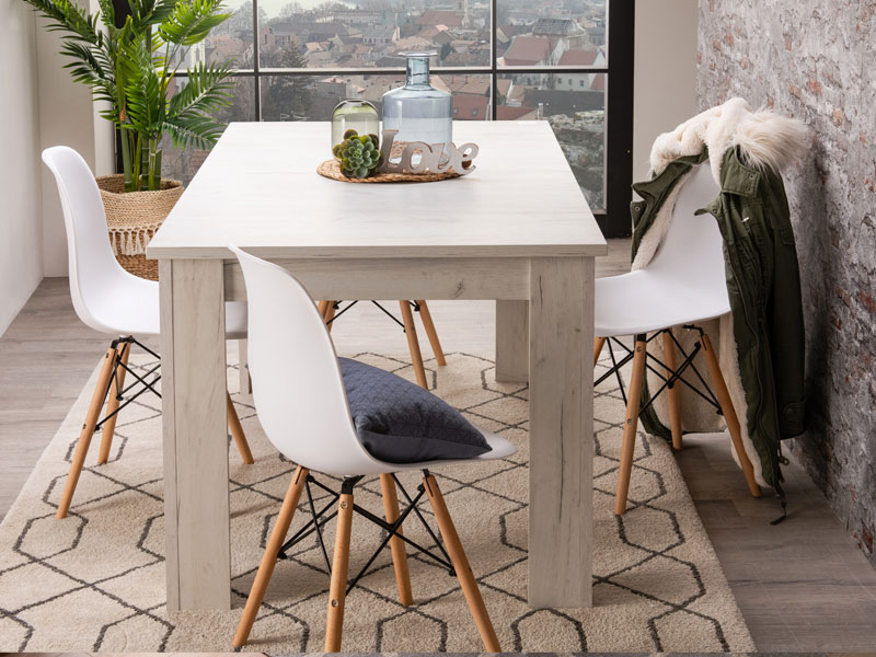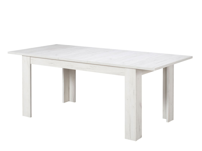 Trpezarijski sto OSCAR TS 160x90, u bijelom hrast dezenu, lako se kombinuje sa ostalim elementima za opremanje trpezarijskog prostora. Ovaj model posjeduje mogućnost proširenja radne površine do dimenzija 200,5x90,5cm