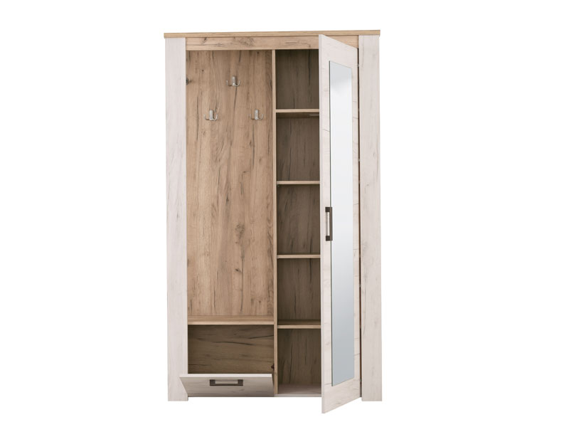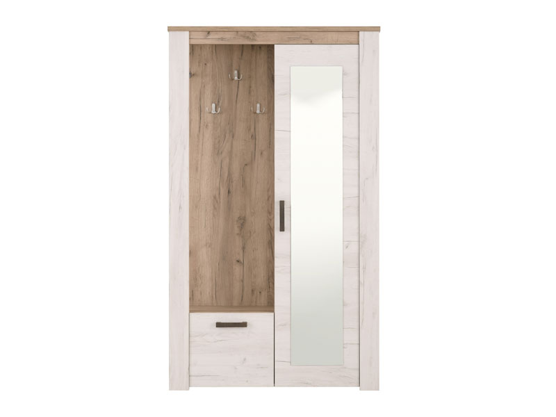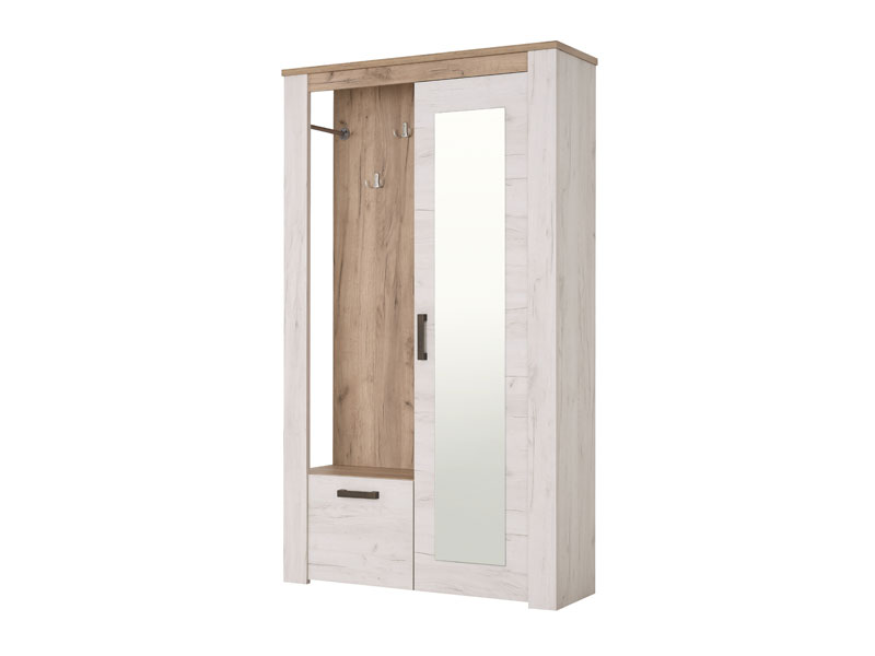 Predsoblje KENT PS, u bijelom i sivom hrast dezenu, dio je istoimene kolekcije koja u vaš dom unosi dodir otmjene klasike i rafiniranog ukusa. Ovaj model posjeduje segment sa policama, manji dio pogodan za sezonsku obuću, kačilice i ogledalo koje svakom predsoblju daje notu prostranosti i vedrine.