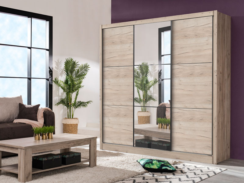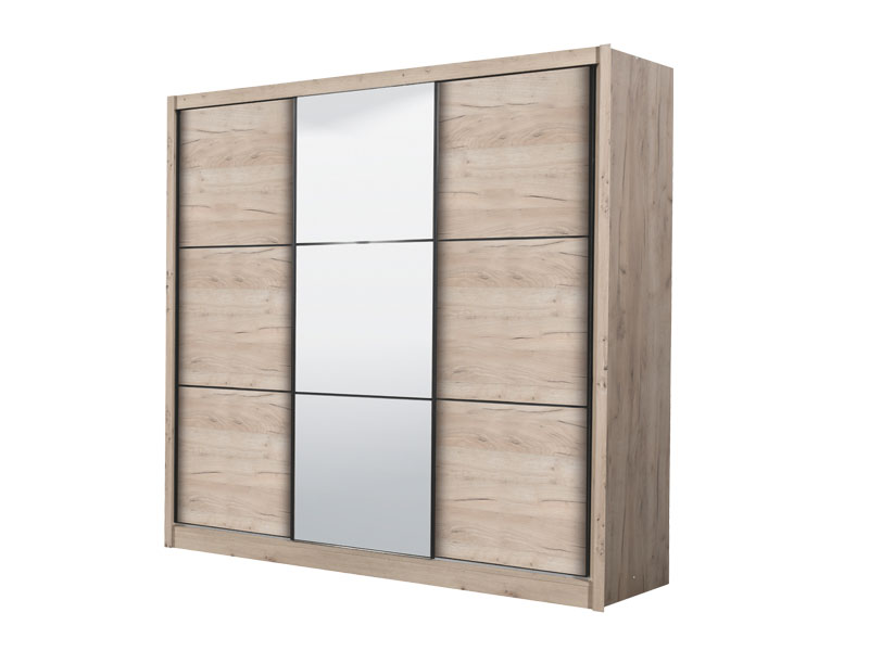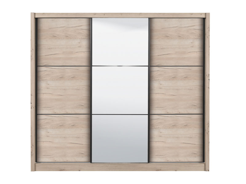 Garderober NAVARA 245 OG u dezenu sivog hrasta je moderno dizajnirano i praktično rješenje za odlaganje. Unutrašnjost se sastoji od segmenta sa policama u lijevom i desnom dijelu, kao i segmenta sa garderobnom šipkom u središnjem dijelu. Poseban benefit ovog modela je klizni mehanizam koji doprinosi ekonomičnoj organizaciji raspoloživog prostora, kao i ogledala smještenog na centralnom dijelu garderobera. Dio je linije NAVARA garderobera, tako da je stilski uklopiv i sa ostalim modelima.