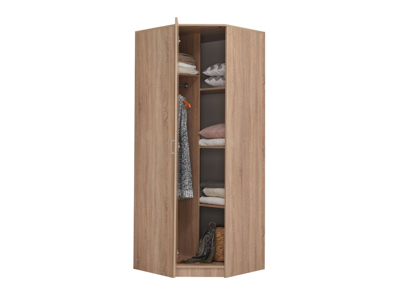 Funkcionalni model ormara HANA UGAONI, u sonoma hrast dezenu, efektno racionalizuje ugaoni prostor u enterijeru namijenjen odlaganju odeće. Uspešno organizovan prostor ormara HANA UGAONI sastoji se od polica i garderobne šipke.