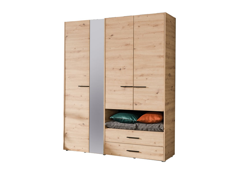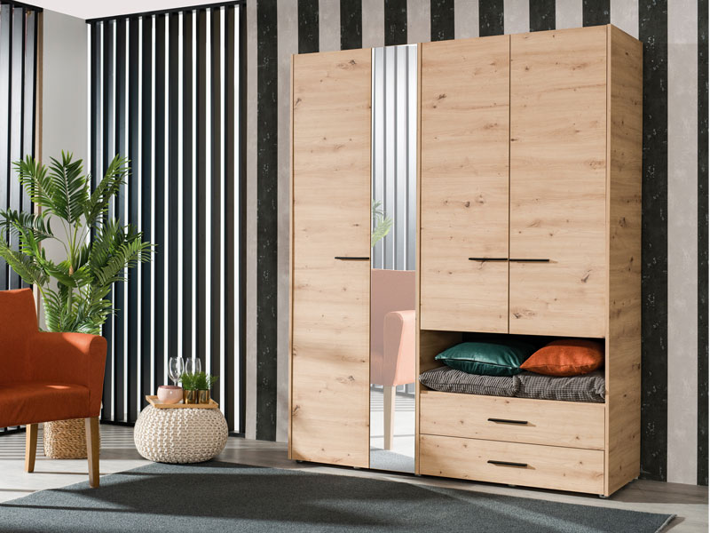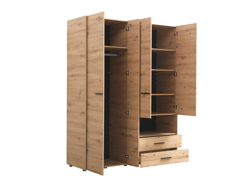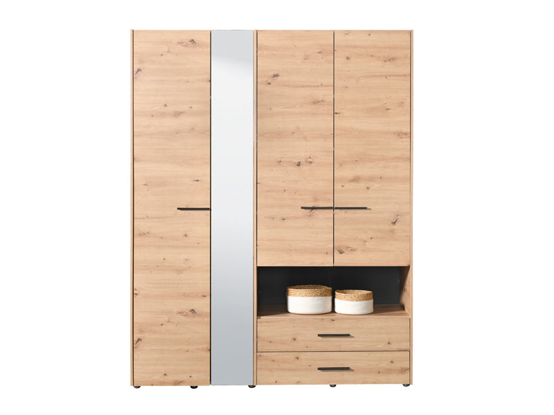 Ormar LEON 4K2FO, u dezenu artisan hrasta, sa garderobnom šipkom sa lijeve strane, kao i dvokrilno zatvorenim policama, jednom otvorenom policom i dvije fioke sa desne strane, funkcionalno će doprinijeti organizaciji ambijenta. Ogledalo na središnjem dijelu ormara LEON 4K2FO estetski će oplemeniti i vizuelno povećati ambijent životnog prostora u kome se nalazi.