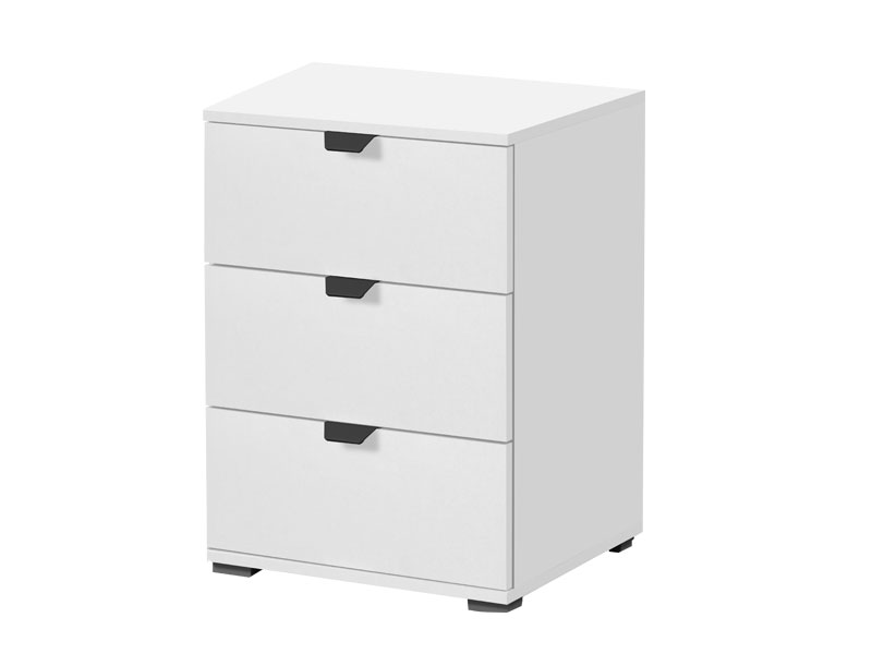 Noćni ormarić DUERO 3F u kombinaciji opak belog dekora i bele lak folije je inovativni model noćnog ormarića, praktičnog dizajna, sa tri vertikalno smještene fioke. Funkcionalan je dio spavaće sobe i doprinosi estetici ambijenta.