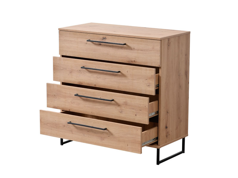 Komoda SARDINIA 4F, spoj je topline naturalnog i rustičnog artisan hrasta sa primjesama suptilnih crnih elemenata dekora, kao karakteristike industrijskog stila u dizajnu enterijera. Sastoji se od četiri funkcionalne fioke. Dio je istoimene kolekcije SARDINIA sa kojom čini enterijersku cjelinu, a koja u vaš dom unosi odraz autentičnog i odvažnog životnog stila.