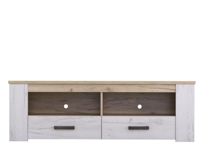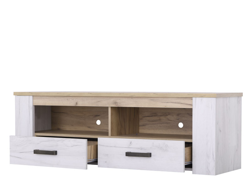 TV polica KENT 150, u bijelom i sivom hrast dezenu, posjeduje otvoreni segment upotpunjen sa dijve praktične fioke. Dio je istoimene kolekcije koja donosi dizajnerski iskorak u kreiranju enterijerskih rješenja za uređenje dnevnog boravka, spavaće sobe ili predsoblja.
