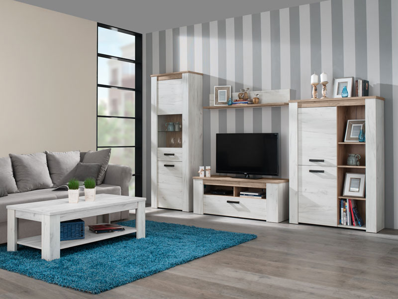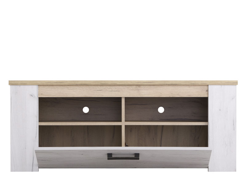 TV polica KENT 120, u bijelom i sivom hrast dezenu, posjeduje kombinaciju zatvorenog i otvorenog segmenta koji su pogodni za odlaganje audio-vizuelne opreme i dekorativnih predmeta. Dio je istoimene kolekcije koja u vaš dom unosi dodir otmene klasike i rafiniranog ukusa.