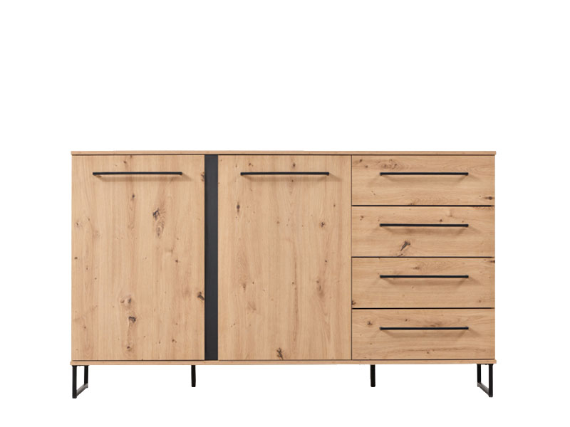 Komoda SARDINIA 3K4F, je spoj topline naturalnog i rustičnog artisan hrasta sa primjesama suptilnih crnih elemenata dekora, kao karakteristike industrijskog stila u dizajnu enterijera. Sastoji se od dva segmenta sa pregradnim policama, kao i četiri funkcionalne fioke. Dio je istoimene kolekcije SARDINIA sa kojom čini enterijersku cjelinu, a koja u vaš dom unosi odraz autentičnog i odvažnog životnog stila.