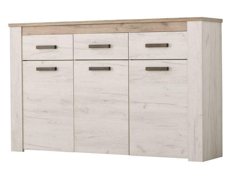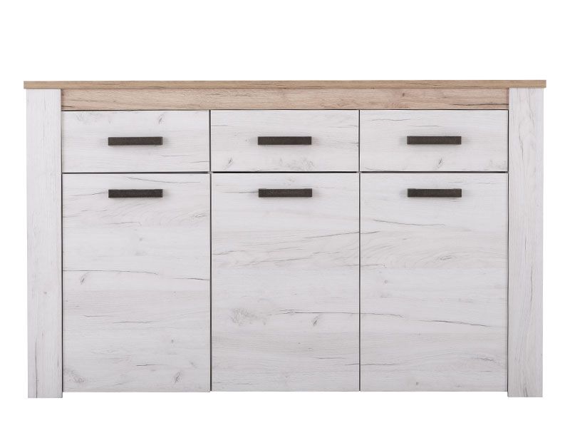 Komoda KENT 160 3K3F, u bijelom i sivom hrast dezenu, posjeduje sistem od tri praktične fioke i tri zatvorena segmenta koja su idealna dopuna garderobnom dijelu. Dio je istoimene kolekcije koja u vaš dom unosi dodir otmene klasike i rafiniranog ukusa.