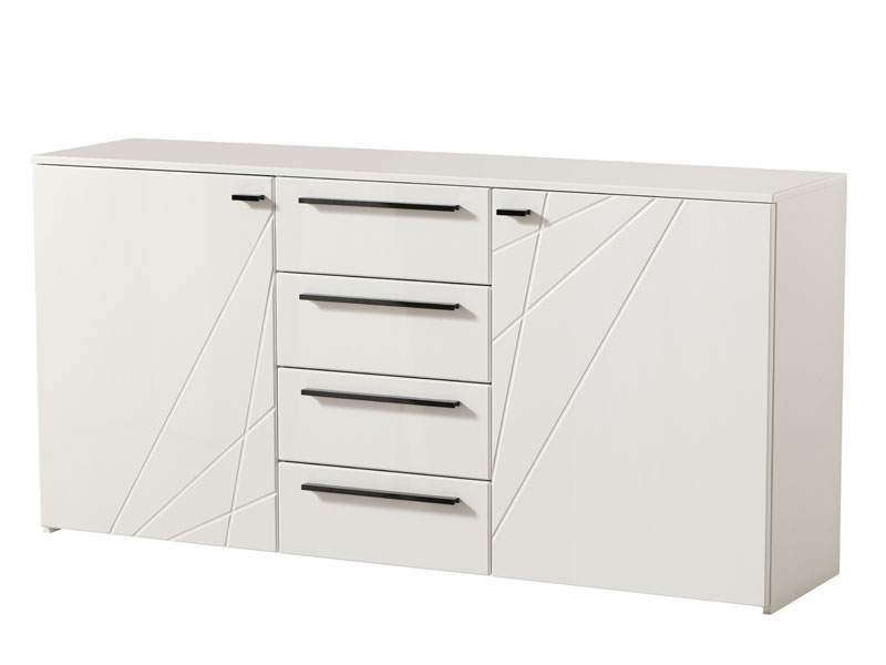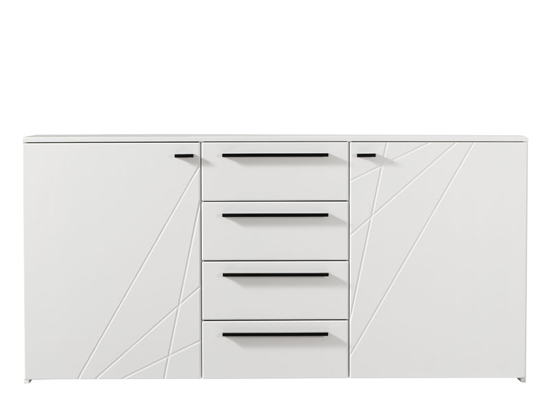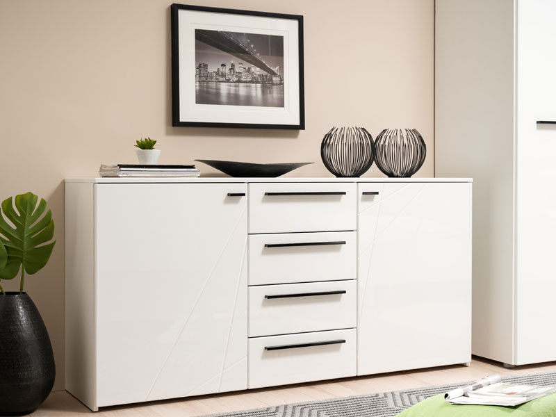 Komoda KSANTI 3K4F, u opak bijelom dezenu sa frontovima presvučenim bijelom 3D MDF lak folijom, dio je istoimene kolekcije elemenata spavaće sobe. Komoda KSANTI 3K4F posjeduje bočne segmente sa pregradnom policom i četiri funkcionalne fioke, smještene u centralnom dijelu.