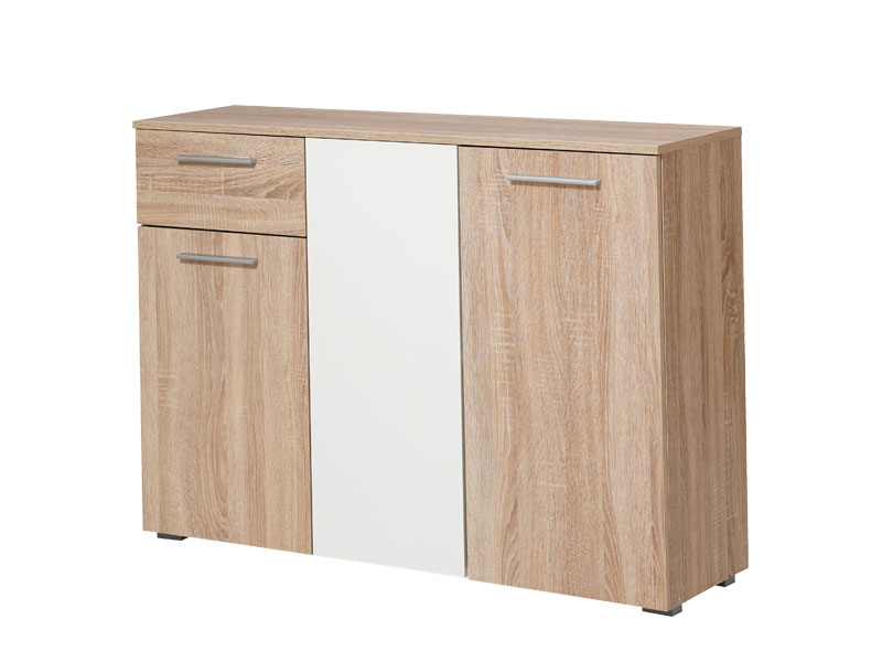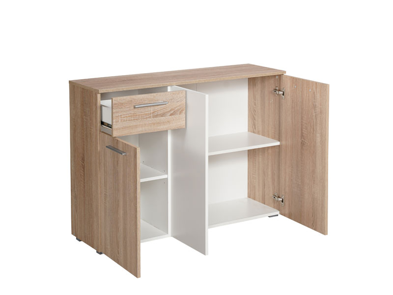 Komoda RITMO 3K1F, u dekoru sonoma hrasta i opak bijele, dio je istoimene kolekcije elemenata spavaće sobe. Sastoji iz tri zatvorena dijela sa horizontalnim policama, i jedne fioke.