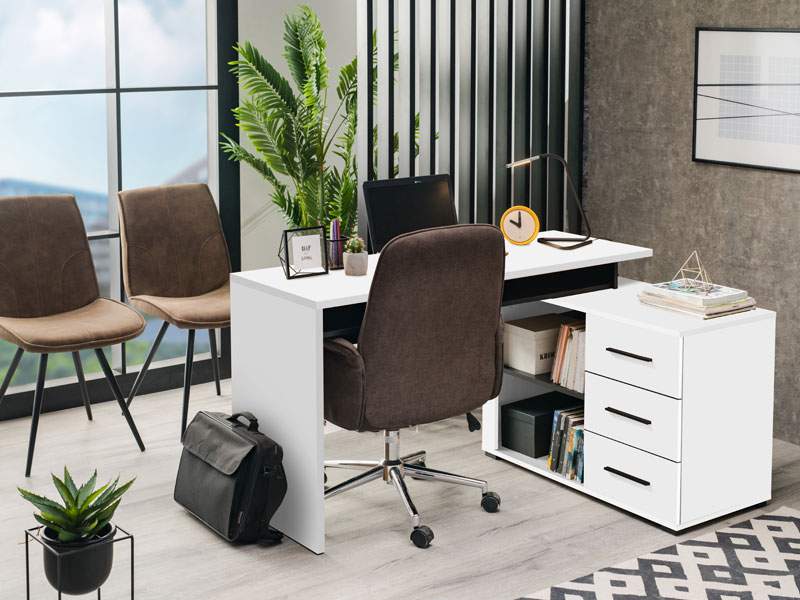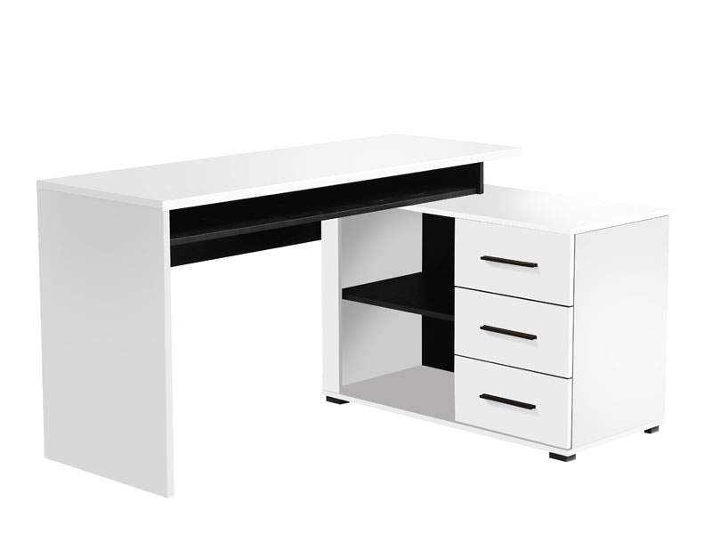 Kompjuter sto ARHIMED, u kombinaciji dekora bijela i crna, sastoji se od radne površine stola i podesivog elementa koji se može montirati pod uglom od 90 i 180 stepeni i idealno će poslužiti za sortiranje dokumenata i važnih stvari jer poseduje 3 praktične fioke i otvoreni dio sa policom.