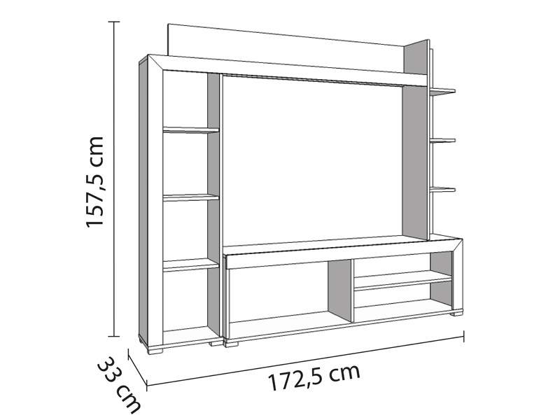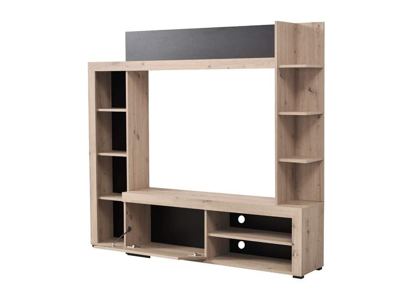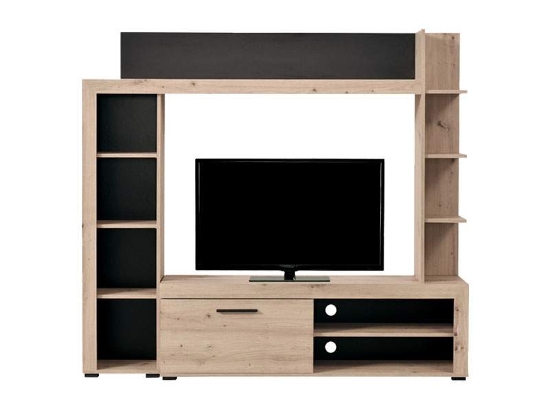Regal RUBI u kombinaciji artisan hrasta i crnog dekora, predstavlja kompaktan model regala za funkcionalno i estetsko uređenje dnevnog boravka. Sastoji se od asimetričnih otvorenih polica različitih dimenzija i jedne zatvorene police, sa stabilnim delom za pozicioniranje TV uređaja. Prostor za TV je 116,5x84cm (do 55").
