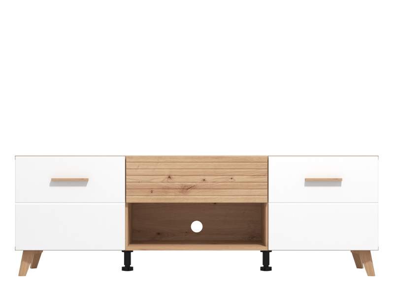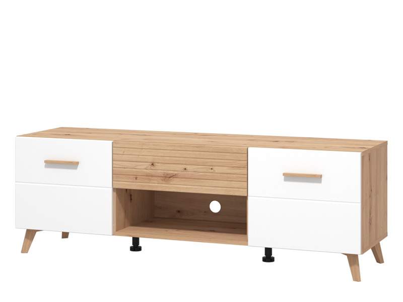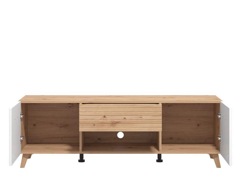 TV polica BRETAGNA TV 150 izrađena je u kombinaciji dekora artisan hrasta sa segmentima u dekoru bijele lak folije, kao i artisan hrast folije, koji unose osvježavajuću estetiku u ambijent. Drvene ručice povezuju dekore u jednu estetsku cjelinu, dok visoki nogari ističu njihovu eleganciju. Dva bočna zatvorena segmenta, praktična fioka, kao i otvorena polica, efektno doprinose funkcionalnoj organizaciji dnevnog boravka.