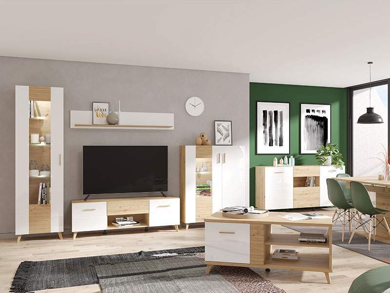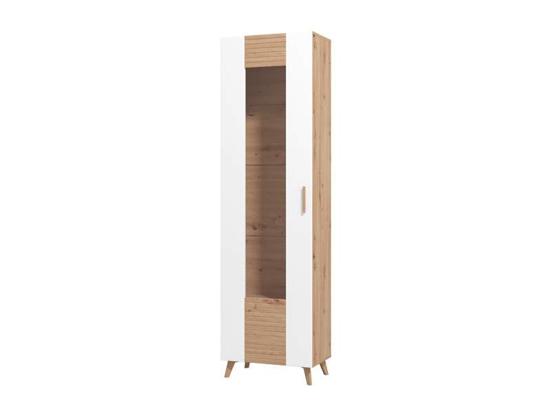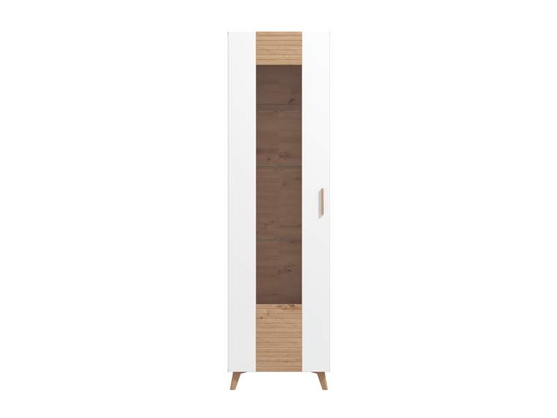 Vitrina BRETAGNA 1K VS1 izrađena je u kombinaciji dekora artisan hrasta sa segmentima u dekoru bijele lak folije, kao i artisan hrast folije, koji unose osvježavajuću estetiku u ambijent. Drvene ručice povezuju dekore u jednu estetsku celinu, dok visoki nogari ističu njihovu eleganciju. Funkcionalnosti ovog elementa doprinosi praktično raspoređen upotrebni prostor. Postoji mogućnost dodavanja rasvjete. Dio je istoimenog sistema elemenata za uređenje ambijenta dnevnog boravka, koje odlikuju karakteristike modernog dizajna ujedinjene sa prefinjenom notom elegancije.