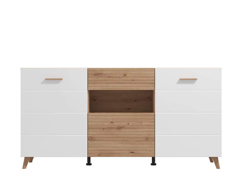 Komoda BRETAGNA 3K1F izrađena je u kombinaciji dekora artisan hrasta sa segmentima u dekoru bijele lak folije, kao i artisan hrast folije, koji unose osvježavajuću estetiku u ambijent. Drvene ručice povezuju dekore u jednu estetsku cjelinu, dok visoki nogari ističu njihovu eleganciju. Odlično raspoređen upotrebni prostor čine jedna praktična fioka, tri zatvorena dijela i otvorena polica. Dio je istoimenog sistema elemenata za uređenje ambijenta dnevnog boravka, koje odlikuju karakteristike modernog dizajna ujedinjene sa prefinjenom notom elegancije.