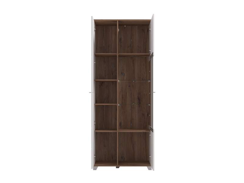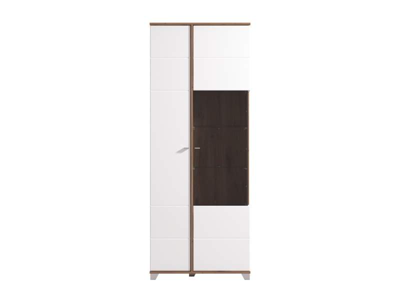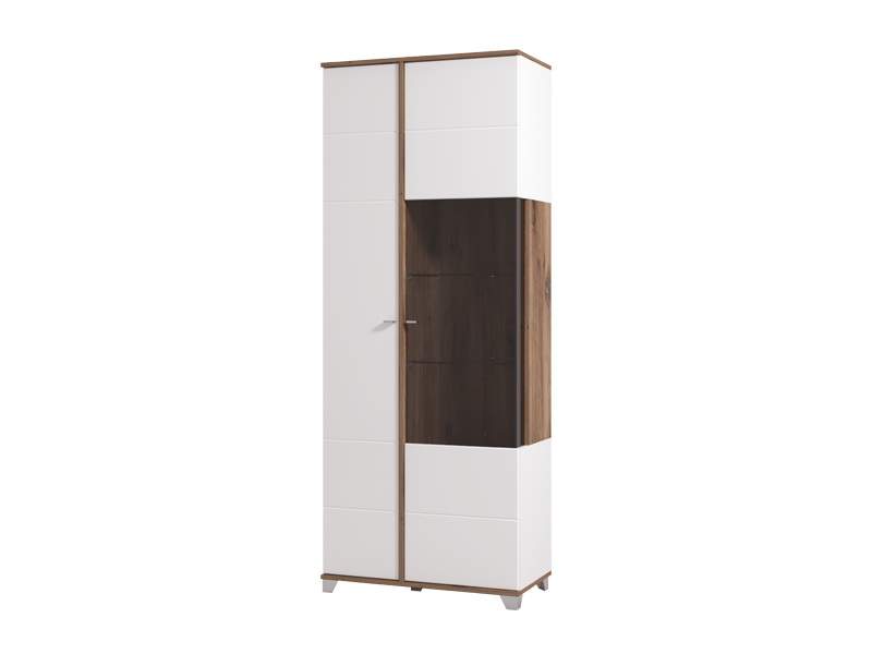 Vitrinu BURGUNDY 2K VS1 200 u kombinaciji toplog dekora flagstaf hrasta i bijele lak folije. Predstavlja novi nivo estetske odvažnosti koja odlikuje najsavremenije domove, dok metalne ručice unose dodatnu ozbiljnost u dizajn ovog sistema elemenata. Odličan je izbor za opremanje dnevnog boravka. Odlikuje je funkcionalno raspoređen prostor za odlaganje, pregradnog tipa, sa jednim zatvorenim i jednom zastakljenim krilom. Iza zastakljenog dijela nalaze se staklene police, koje doprinpose estetici. Postoji mogućnost dodavanja rasvete, a zatvoreni pregradni dijelovi odlikuju se „soft close“ sistemom zatvaranja.