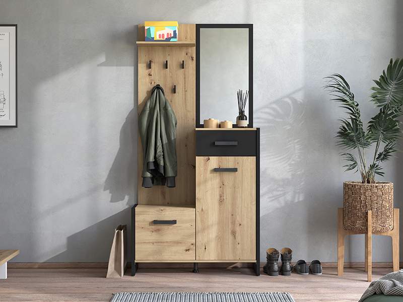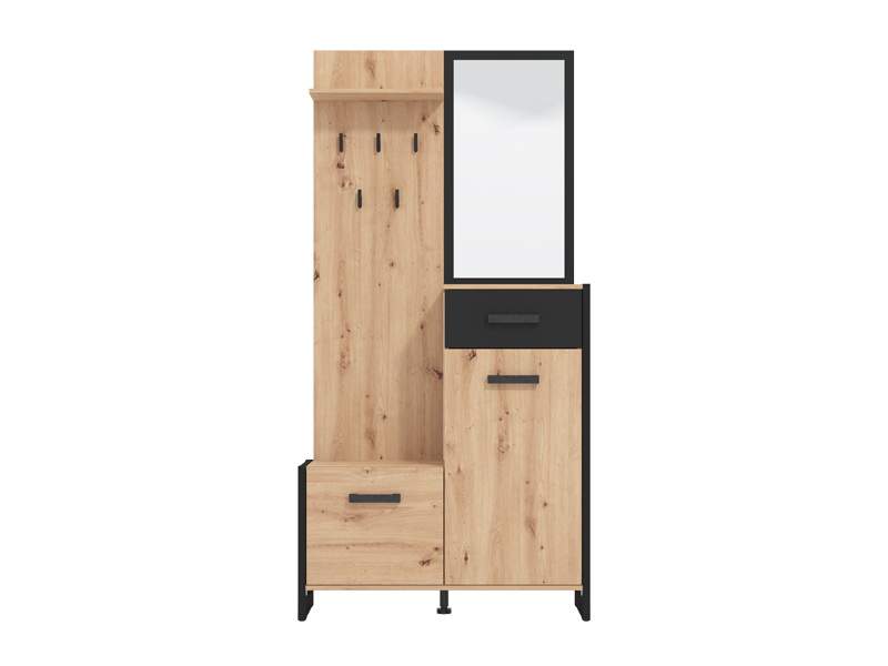 Predsoblje OLERON, u kombinaciji artisan hrast boje, crne boje i crne mat folije, učiniće da prvi suret sa vašim domom bude efektan i prijatan. Ovaj model posjeduje skladno organizovan upotrebni prostor za odlaganje obuće, dok ogledalo donosi osećaj prostranosti.