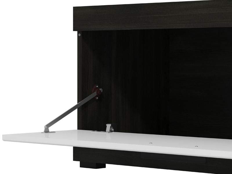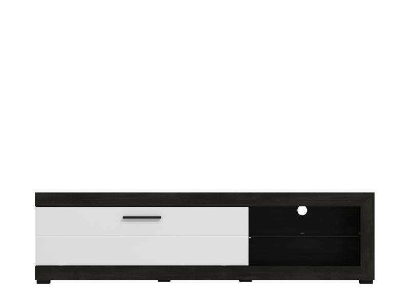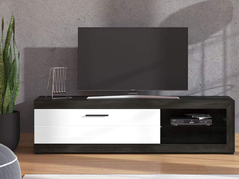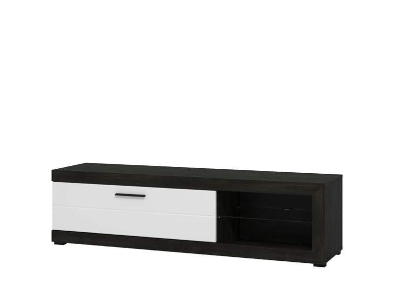 TV polica REMO, u kombinaciji dezena crnog bijeljenog drva sa bijelom lak folijom, sa kombinacijom otvorenog i zatvorenog segmenta sa pregradnim dijelom, prati praktične enterijerske inovacije koje će se idealno integrisati u ambijent vašeg dnevnog boravka.