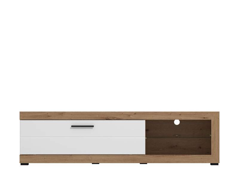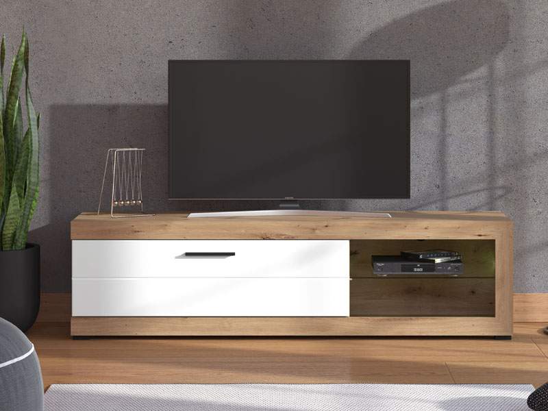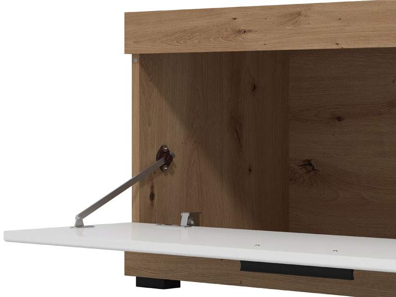 TV polica REMO, u artisan hrast dezenu sa bijelom mat folijom, sa kombinacijom otvorenog i zatvorenog segmenta sa pregradnim dijelom, prati praktične enterijerske inovacije koje će se idealno integrisati u ambijent vašeg dnevnog boravka.