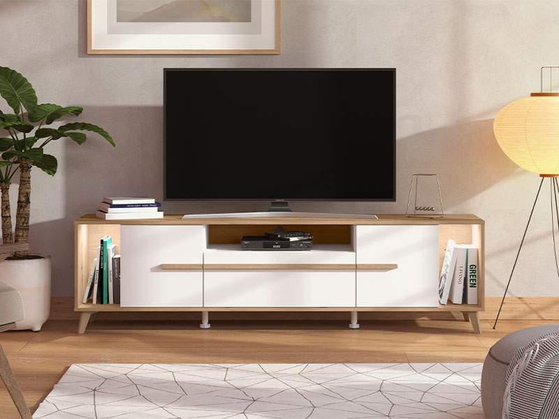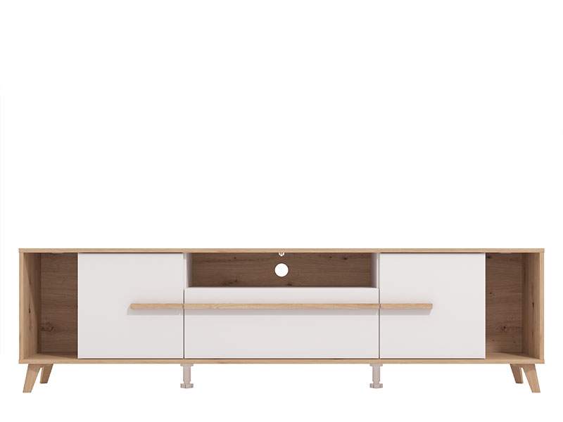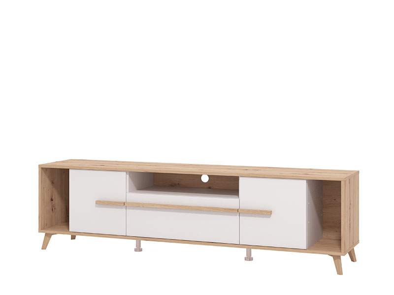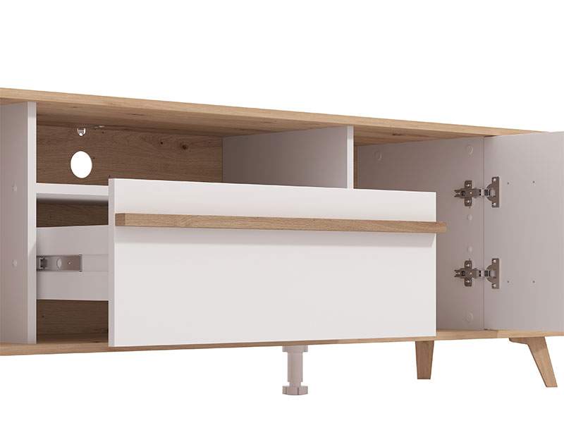 TV polica ORLEANS je sjajan funkcionalni dodatak za uređenje ambijenta dnevnog boravka. Kombinacija opak bijelog dekora, artisan hrasta i artisan hrast folije, unose osvježavajuću estetiku u ambijent. Dva zatvorena segmenta, praktična fioka, kao i otvoreni segmenti, efektno doprinose funkcionalnoj organizaciji TV kutka. Postoji mogućnost dodavanja rasvjete.