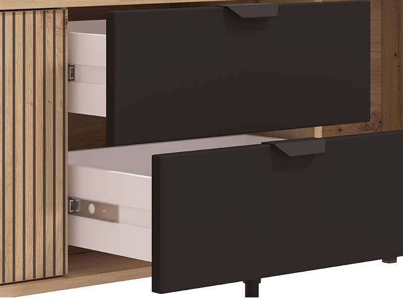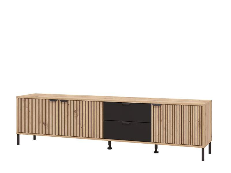 TV polica MAYENNE TV 208 4K3F3V, u kombinaciji dekora artisan hrasta i crne mat folije, dio je istoimene kolekcije koja će doprinijeti da vaš dom bude opremljen po najnovijim enterijerskim standardima. TV polica MAYENNE TV 208 4K2F3V posjeduje tri zatvoren segmenta sa pregredama i dvije fioke.