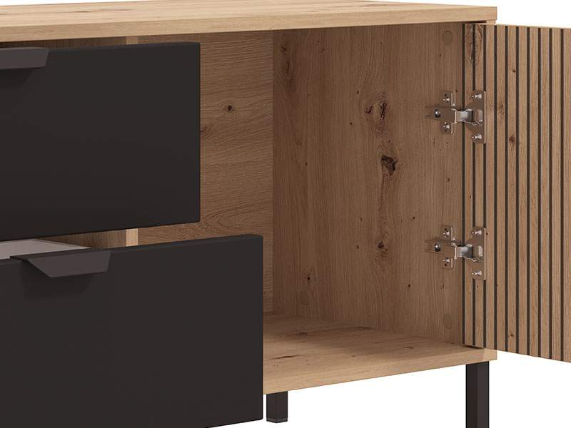 TV polica MAYENNE TV, u kombinaciji dekora artisan hrasta i crne mat folije, dio je istoimene kolekcije koja će doprinijeti da vaš dom bude opremljen po najnovijim enterijerskim standardima. TV polica MAYENNE TV 157 3K2F2V posjeduje zatvorene segmenta sa dvije fioke.