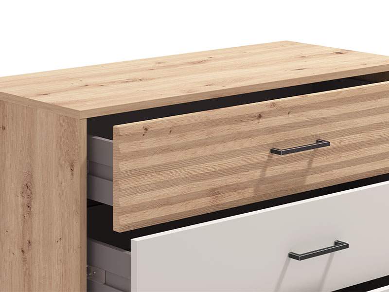 Garderober MODENA 220 OG h217 u kombinaciji dekora artisan hrasta, artisan hrast folije i kašmir dekora, predstavlja spoj funkcionalnog i moderno dizajniranog komada namještaja koji će doprinijeti kako estetici, tako i funkcionalnosti ambijenta spavaće sobe. Segment sa ogledalom na lijevom frontu, doprinosi enterijerskoj praktičnosti i maksimalnoj iskorišćenosti prostora. Upotrebni prostor ovog modela čine garderobne šipke. Posjeduje mogućnost dodavanja polica, vertikala, fioka, usporivača za klizni mehanizam, rama za garderober koji doprinosi izgledu masivnosti, kao mogućnost dodavanja rasvjete.
