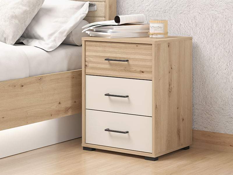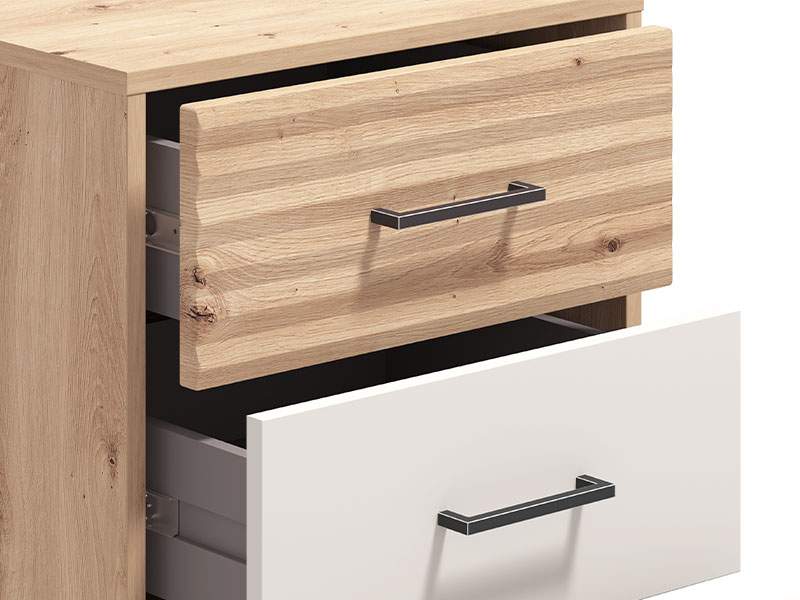 Noćni ormarić MODENA NO2F u kombinaciji dekora artisan hrasta, artisan hrast folije i kašmir dekora, predstavlja spoj funkcionalnog i moderno dizajniranog komada namještaja koji je neophodan i veoma praktičan element u svakom ambijentu spavaće sobe. Upotrebni prostor noćnog ormarića čine dvije praktične fioke. Dio je istoimenog sistema elemenata za opremanje spavaće sobe MODENA, moderne dizajnerske forme.