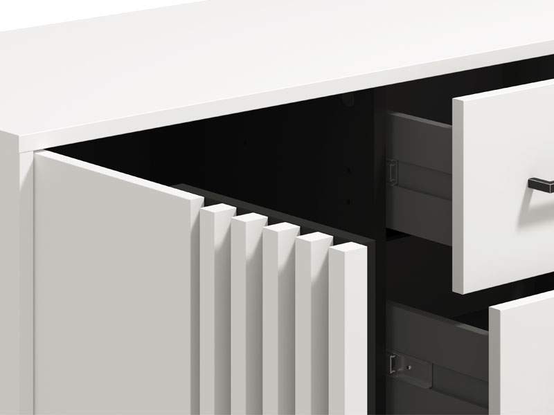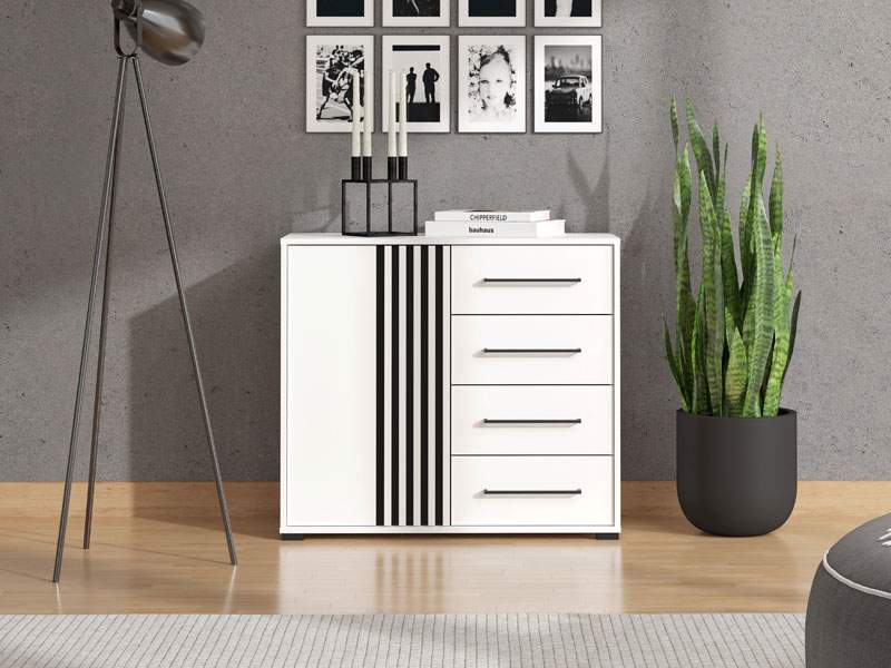 Komoda ASCALON 2K4F 90 u kombinaciji opak bijelog dekora, crnog dekora i bijele mat folije, moderno je dizajniran i autentičan komad nameštaja koji će, doprineti kako estetici, tako i funkcionalnosti ambijenta spavaće sobe. Odlično raspoređen upotrebni prostor čine četiri praktične fioke u desnom dijelu, kao i zatvoreni pregradni dio sa lijeve strane.