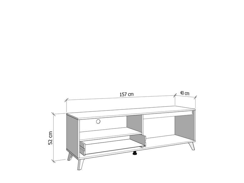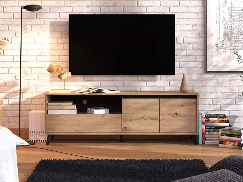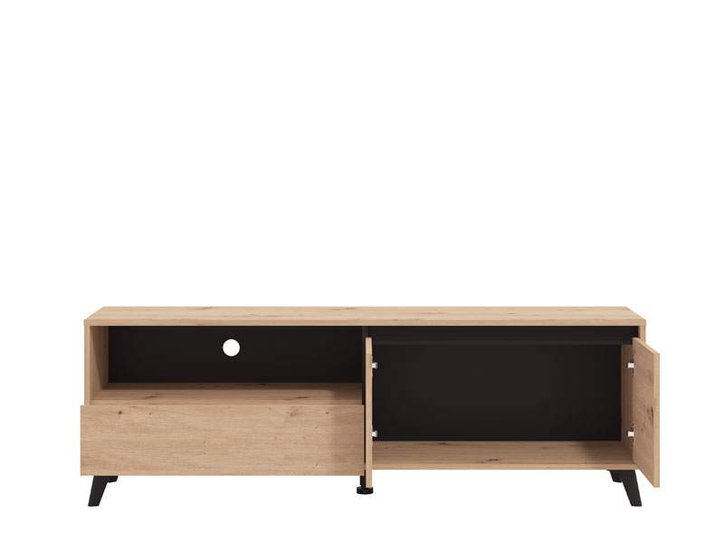 TV polica STIRLING TV 157 3K1F2V izrađena je u kombinaciji dekora artisan hrasta, crnog dekora i crne mat folije, koji toplinu u moderan ambijent dnevnog boravka unose naglašenim kontrastom. Drveni podignuti nogari ističu ovaj model TV police i doprinose njenoj cjelokupnoj estetici. Dva zatvorena segmenta, praktična fioka, kao i otvorena polica, efektno doprinose funkcionalnoj organizaciji dnevnog boravka.