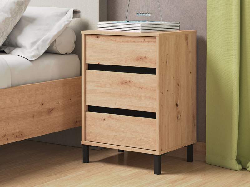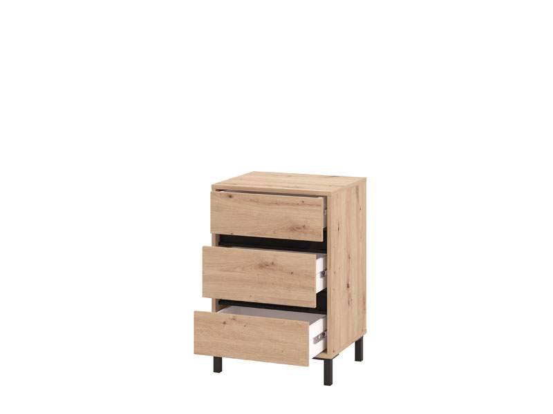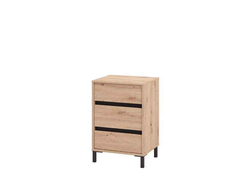 Noćni ormarić MARRON NO3F, u kombinaciji artisan hrast dekora i crne mat folije, moderno je dizajniran i autentičan komad namještaja koji je neophodan i veoma praktičan element u svakom ambijentu spavaće sobe. Upotrebni prostor noćnog ormarića čine tri praktične fioke.