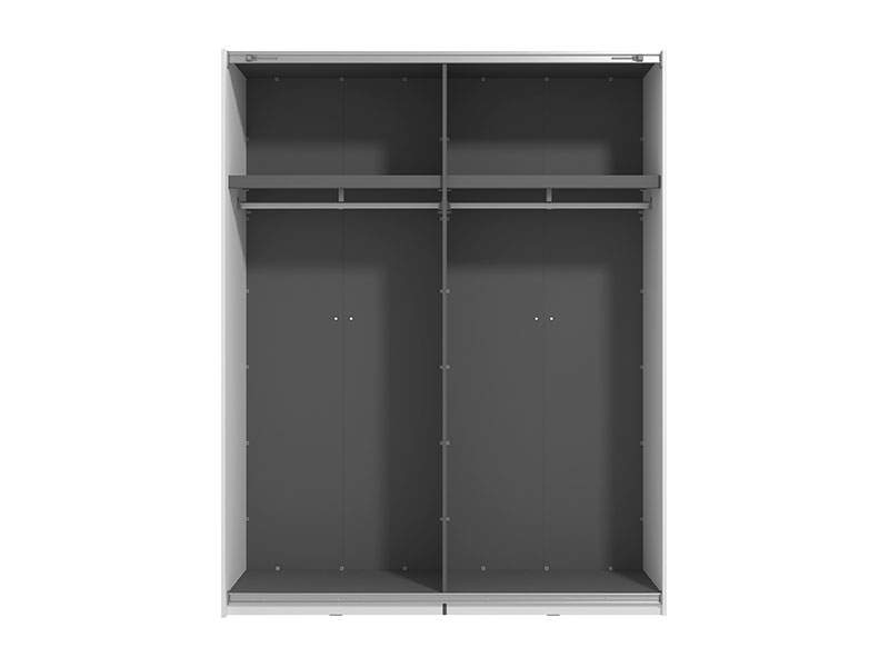 Garderober VEYMONT 150 OG h217 s kliznim vratima, u opako bijelom dekoru i segmentom s ogledalom na lijevom frontu, doprinosi enterijerskoj funkcionalnosti i estetici. Dio je kolekcije garderobera VEYMONT i predstavlja elegantno i veoma atraktivno dizajnersko rješenje, čija izražena estetika doprinosi cjelokupnom ambijentalnom utisku. Upotrebni prostor ovog modela čine garderobne šipke i po jedna praktična polica s lijeve i desne strane. Posjeduje mogućnost dodavanja seta polica odgovarajućih za ovaj model garderobera, kao i mogućnost ugradnje usporivača za klizna vrata.