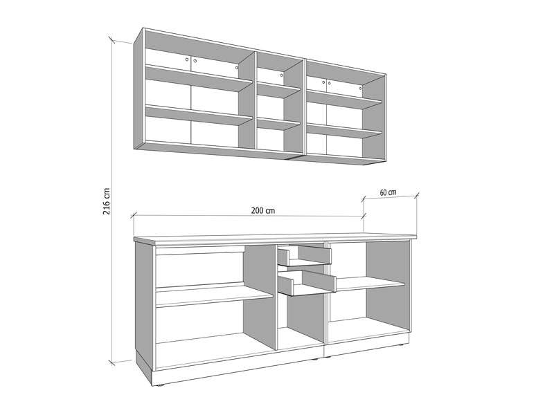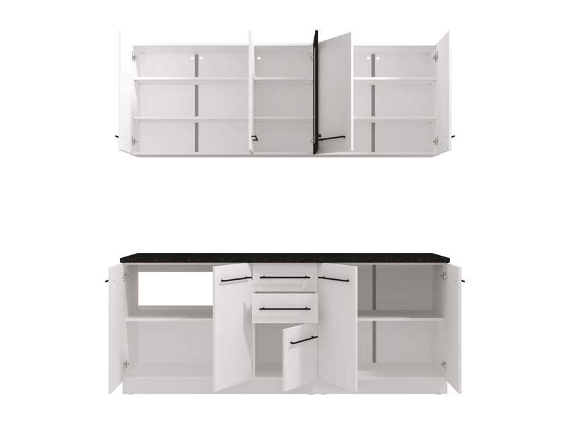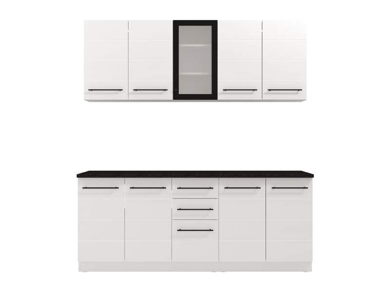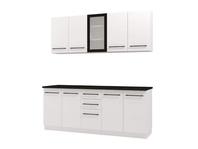 Kuhinja RAJNA 200 predstavlja kompletno rješenje za uređenje kuhinjskih prostorija. Jedinstveni suvremeni dizajn u kombinaciji dekora opak bijele i crne mat folije zadovoljava estetske zahtjeve u uređenju svakog suvremenog ambijenta. Zahvaljujući funkcionalnom rasporedu visećih zatvorenih i jednog zastakljenog pregradnog dijela s kontrastnim okvirom, kao i donjih pregradnih dijelova i jednog segmenta s ladicama, zadovoljava sve zahtjeve suvremenog doma. Predstavljeni model kuhinje je bez sudopera i radne ploče.
