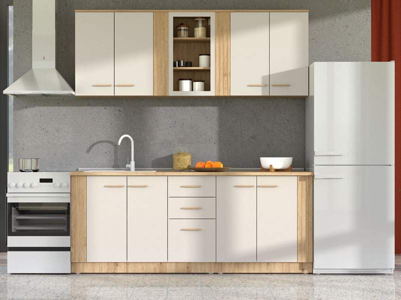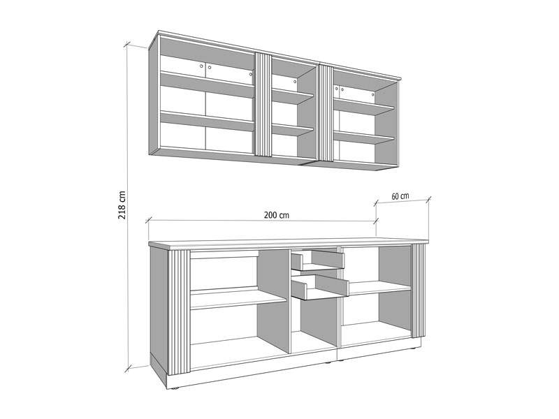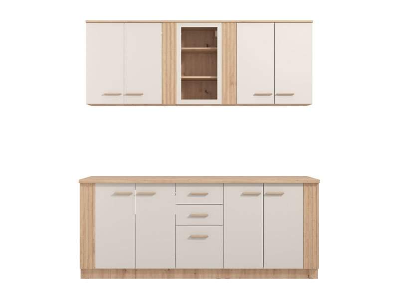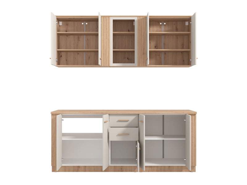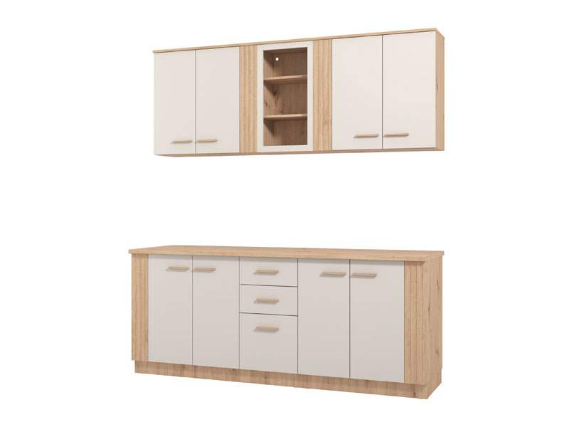 Kuhinja BELFORT 200 predstavlja kompletno rješenje za uređenje kuhinjskih prostorija. Kombinacija kašmir dekora, artisan hrast folije i kašmir mat folije daje ovom modelu kuhinje jedinstveni suvremeni dizajn i naglašenu estetiku. Zahvaljujući funkcionalnom rasporedu visećih zatvorenih i jednog zastakljenog pregradnog dijela, kao i donjih pregradnih dijelova i jednog segmenta s ladicama, zadovoljava sve zahtjeve suvremenog doma. Predstavljeni model kuhinje je bez sudopera i radne ploče.