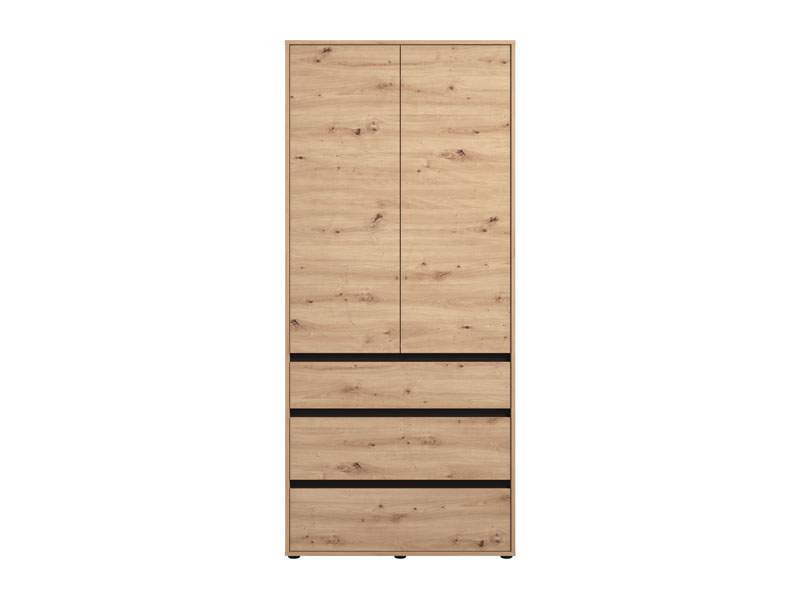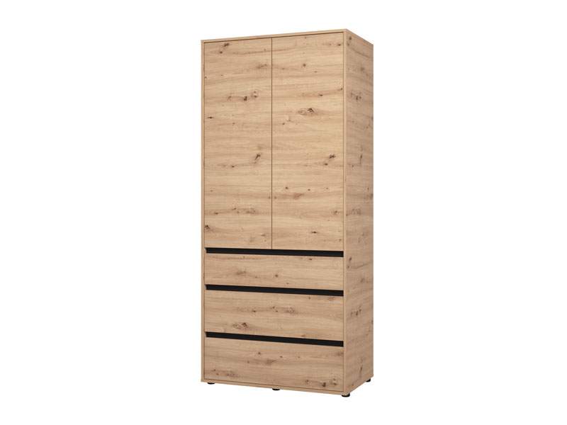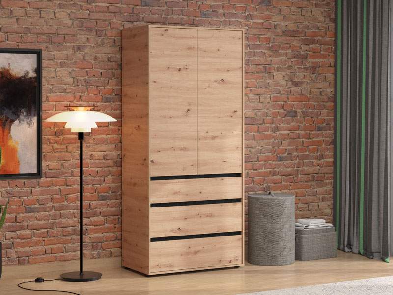 Ormar CORBETT 2K1F h211 u kombinaciji artisan hrast i crne mat folije, sa garderobnom šipkom u gornjem dijelu, jednom praktičnom fiokom u središnjem dijelu i zatvorenim pregradnim segmentom u donjem dijelu, funkcionalno i estetski će doprinijeti organizaciji ambijenta.