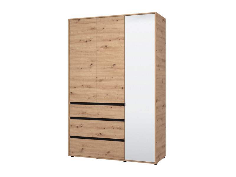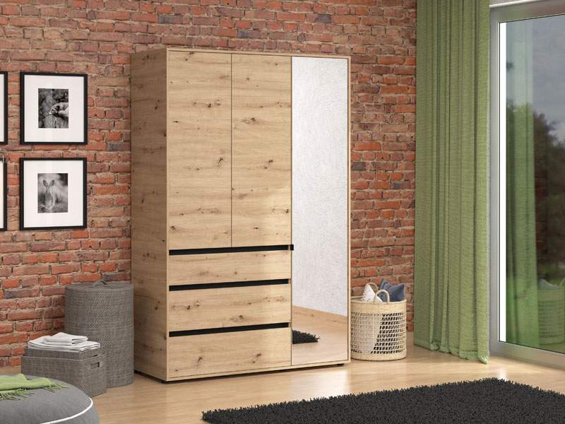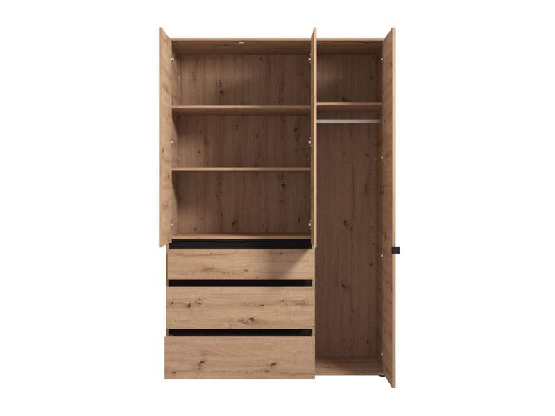Ormar CORBETT 3K3F1O h211 u kombinaciji artisan hrast dekora i crne mat folije dio je kolekcije CORBETT ormara. Upotrebljivi prostor čine garderobna šipka u krilu iza ogledala, dok gornji i donji dio srednjeg i lijevog krila imaju zatvorene pregradne dijelove. U središnjem dijelu nalazi se jedna praktična fioka. Ovakav model ormara funkcionalno doprinosi organizaciji prostora, ali i unapređuje njegovu estetiku.