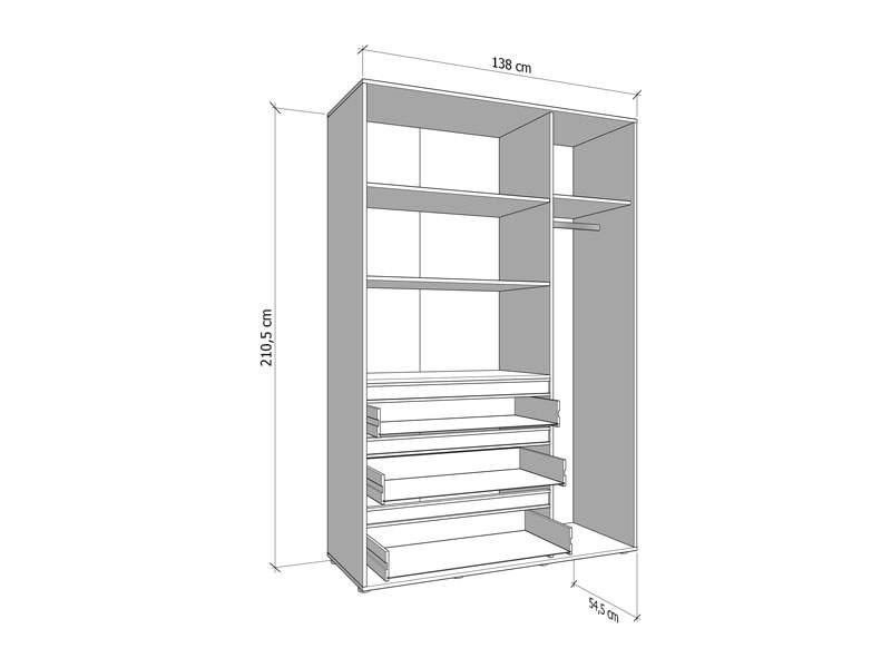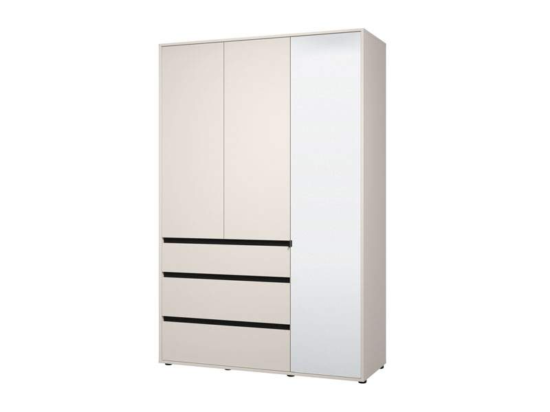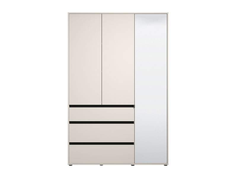 Ormar CORBETT 3K3F1O h211 u kombinaciji kašmir dekora i crne mat folije dio je kolekcije CORBETT ormara. Upotrebljivi prostor čine garderobna šipka u krilu iza ogledala, dok gornji i donji dio srednjeg i lijevog krila imaju zatvorene pregradne dijelove. U središnjem dijelu nalazi se jedna praktična fioka. Ovakav model ormara funkcionalno doprinosi organizaciji prostora, ali i unapređuje njegovu estetiku.