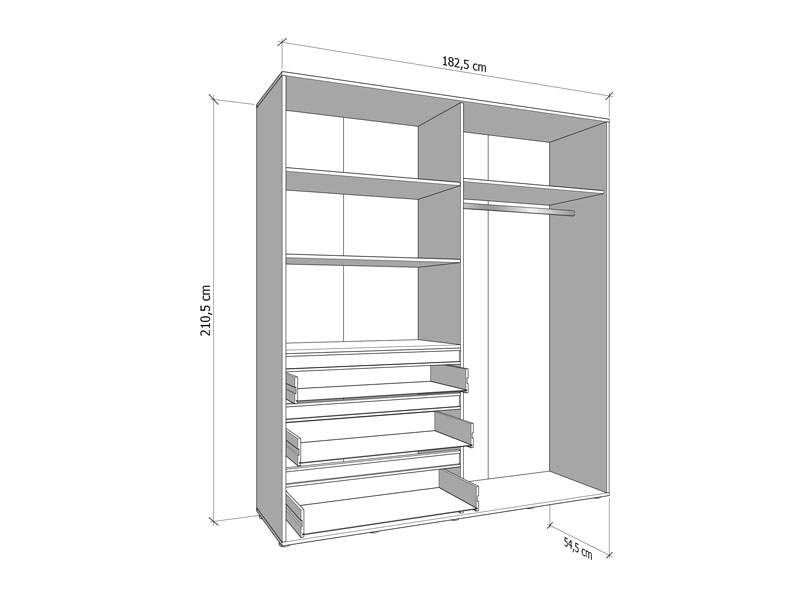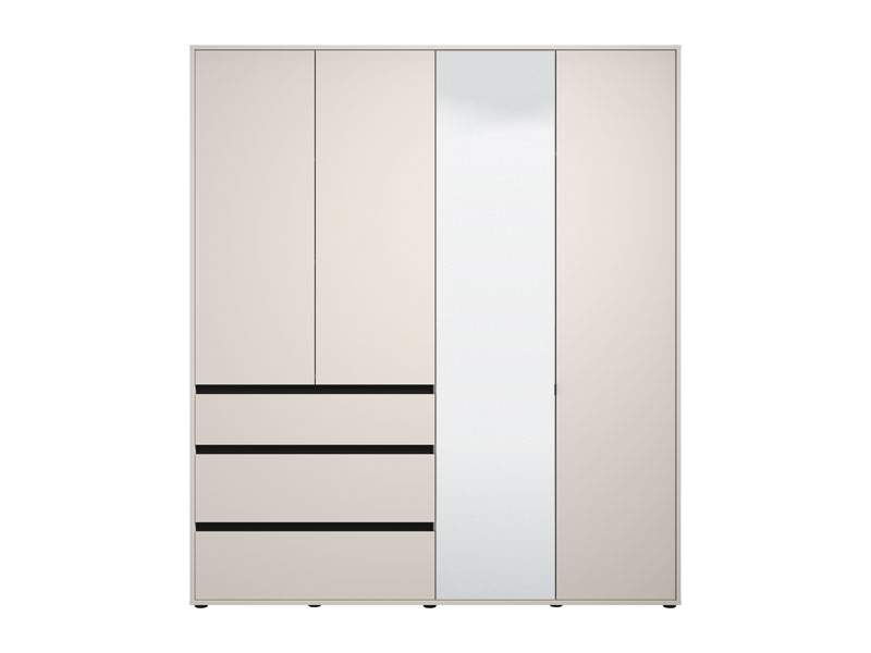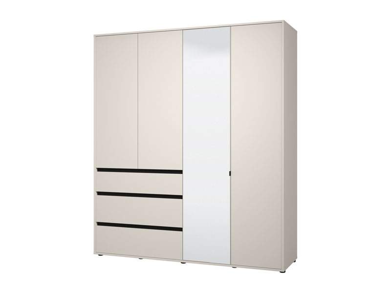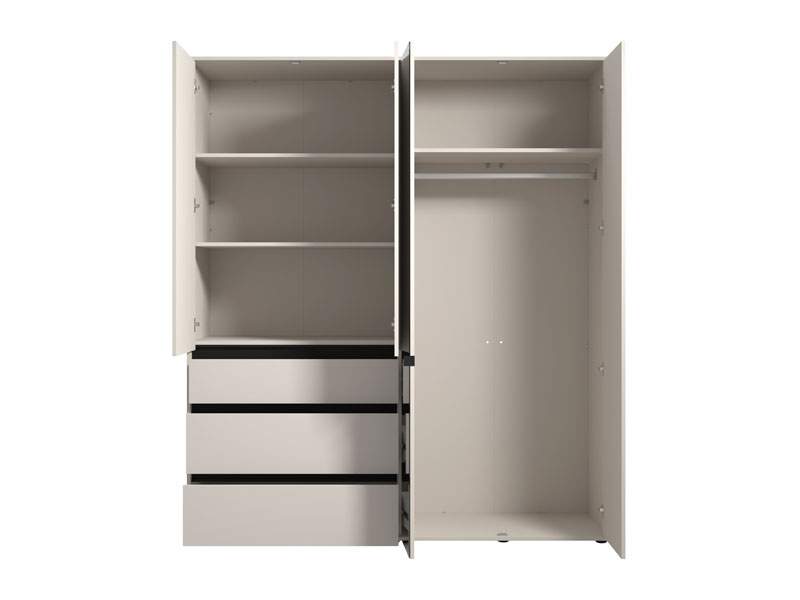 Ormar CORBETT 4K3F1O h211 u kombinaciji dekora kašmir i crne mat folije dio je kolekcije CORBETT ormara. Upotrebljivi prostor ovog četverokrilnog ormara čine dio s garderobnom šipkom, zatvoreni pregradni dio i jedna praktična fioka. Ovaj model ormara ima i ogledalo, što doprinosi njegovoj funkcionalnosti i estetici prostora..