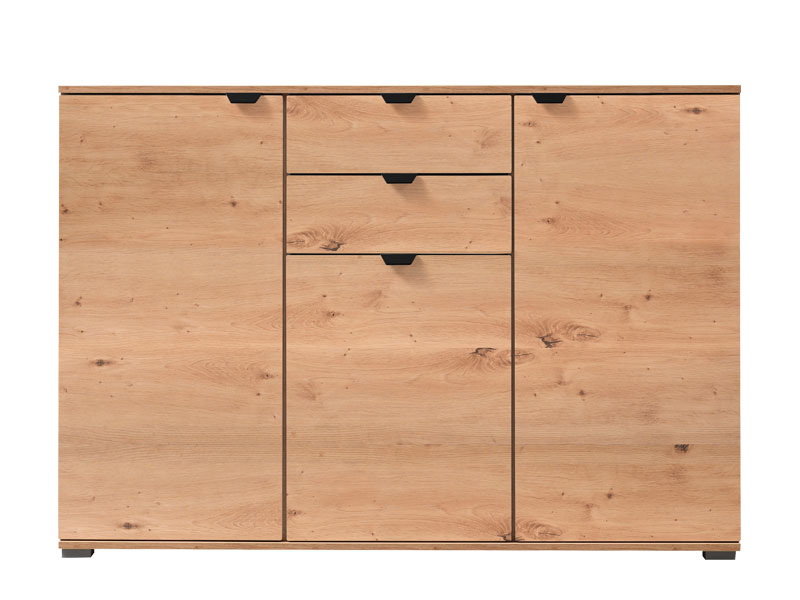 Trokrilna komoda DUERO 3K2F, u dekoru artisan hrast posjeduje dva bočna zatvorena krila sa po tri vertikalne police, kao i centralno pozicioniran segment sa dvije fioke i zatvorenom policom. Zahvaljujući upotrebnom prostoru koji obezbjeđuje svrstava se u elemente velike funkcionalnosti. Komoda DUERO 3K2F je pogodna za opremanje predsoblja, dnevne zone ili spavaće sobe.