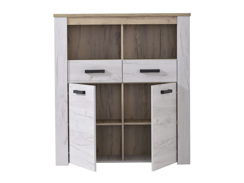 Vitrina KENT POP 2F, u bijelom i sivom hrast dezenu, posjeduje dvije praktične fioke, upotrebni prostor sa policama i otvoreni segment za omiljeni kućni dekor. Dio je istoimene kolekcije koja u vaš dom unosi dodir otmjene klasike i rafiniranog ukusa.