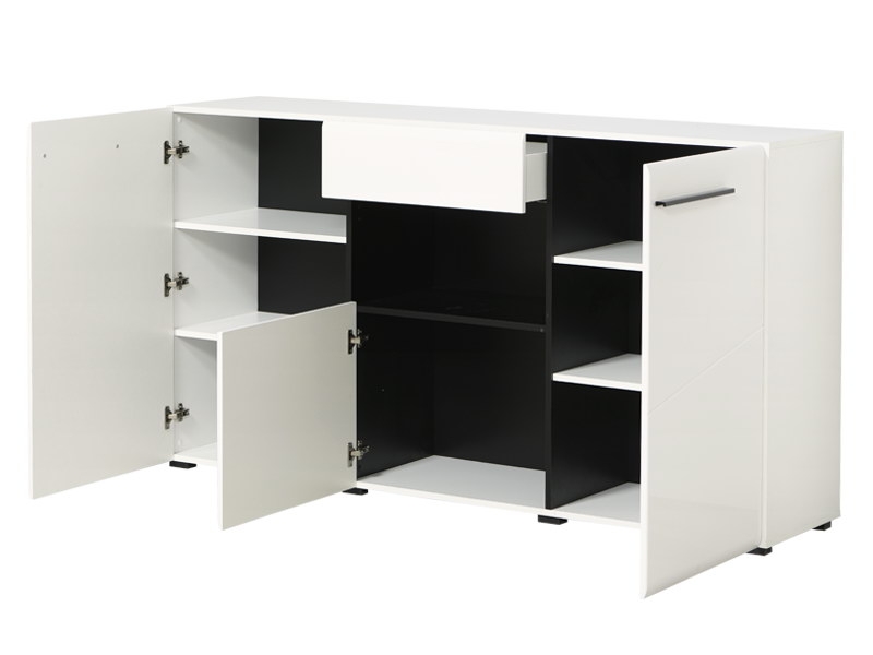 Komoda TRENTINO 3K1F, u kombinaciji opak bijele i crne sa frontovima presvučenim bijelom lak folijom sa 3D aplikacijama, dio je sistema elemenata TRENTINO čiji dizajn i funkcionalnost doprinose praktičnim i estetski autentičnim rješenjima za opremanje enterijera. Sastoji se od tri zatvorena dijela sa unutrašnjim pregradama i jedne fioke.
